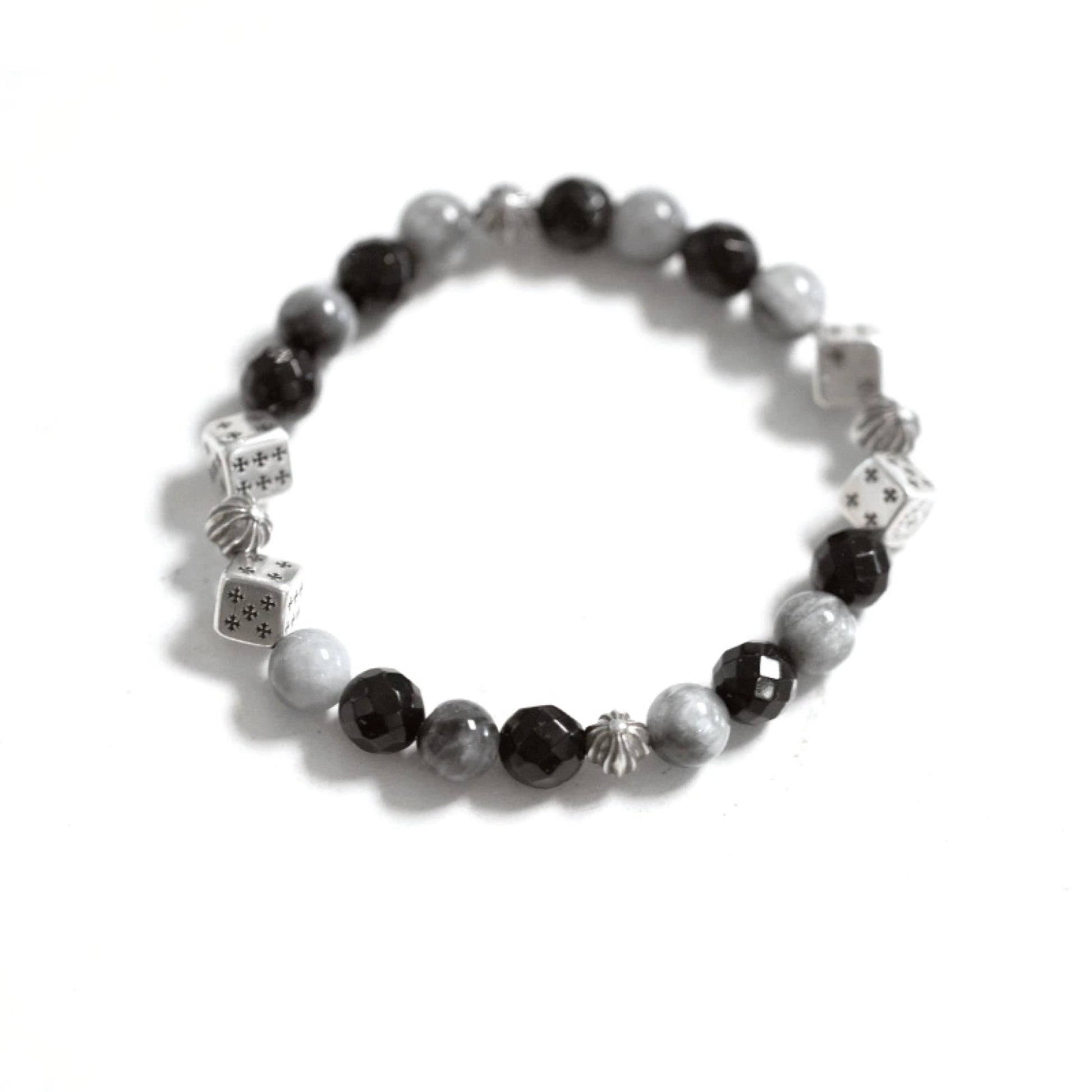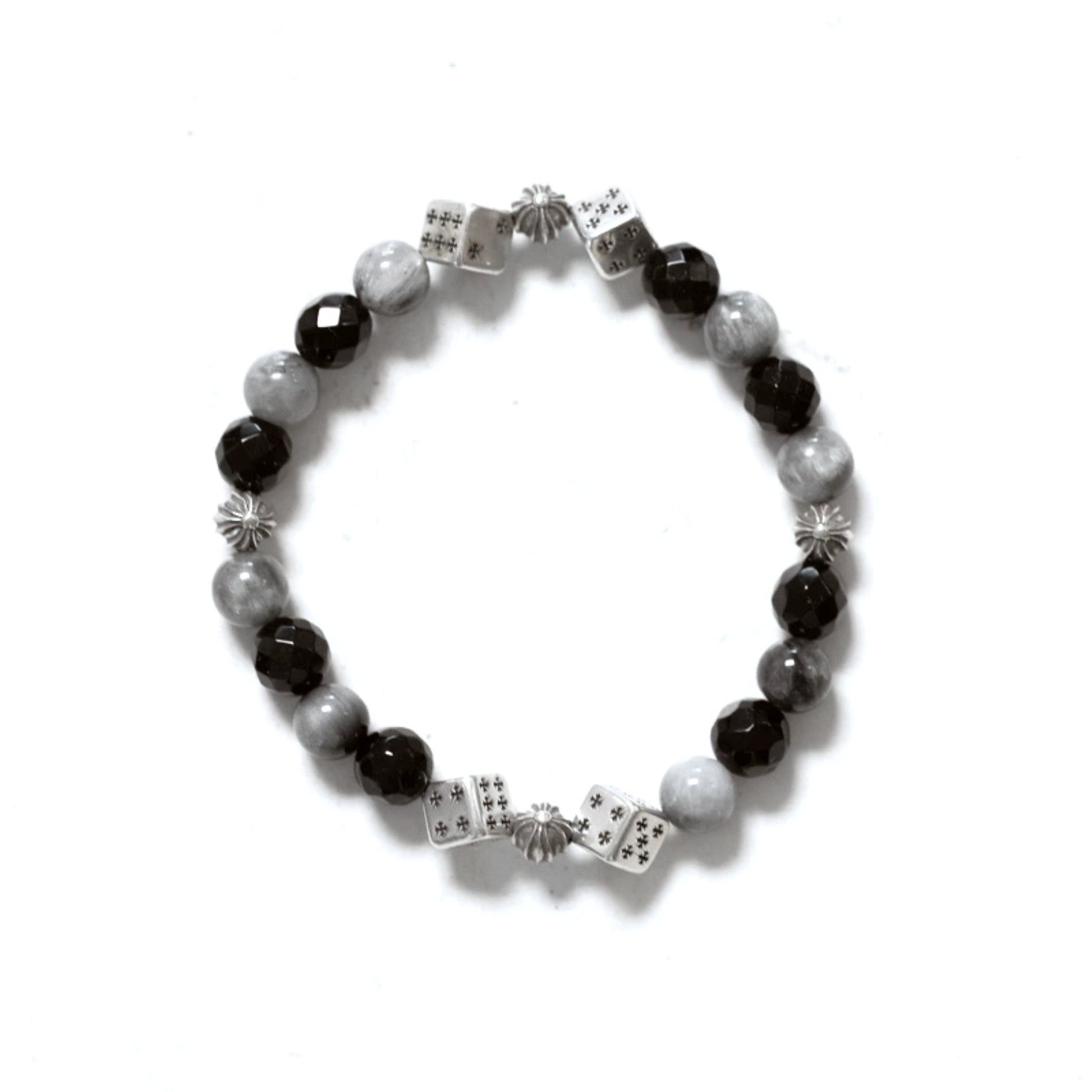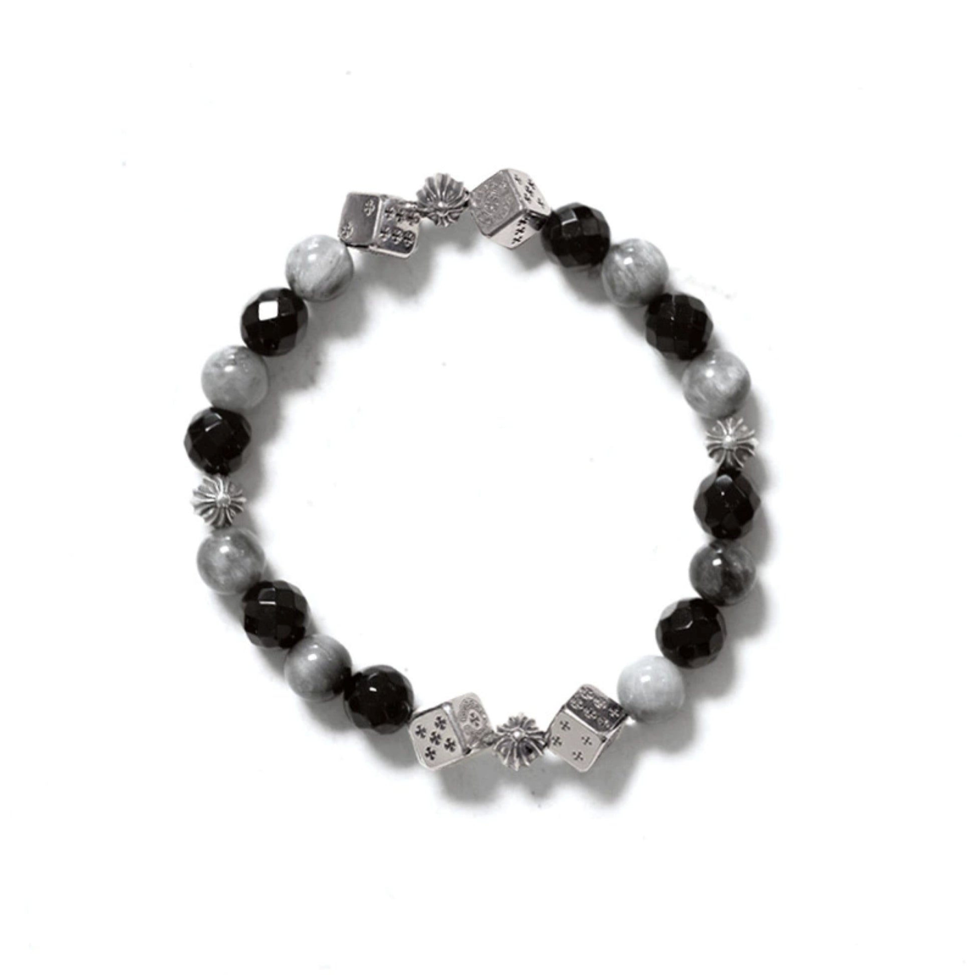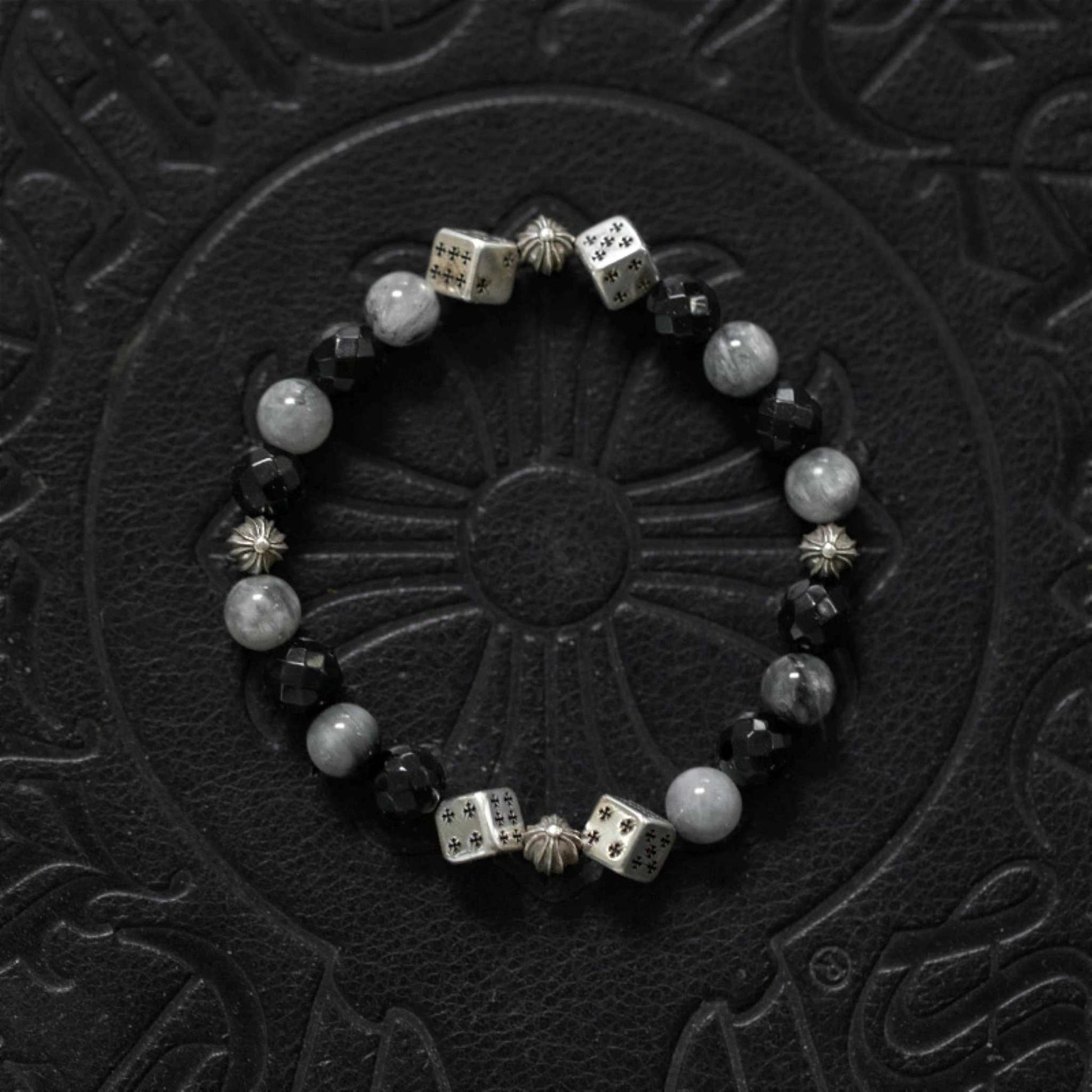 Chrome Hearts Cross Ball & Cube Dice Obsidian Beaded Bracelet, Sterling Silver Punk Statement Bracelets