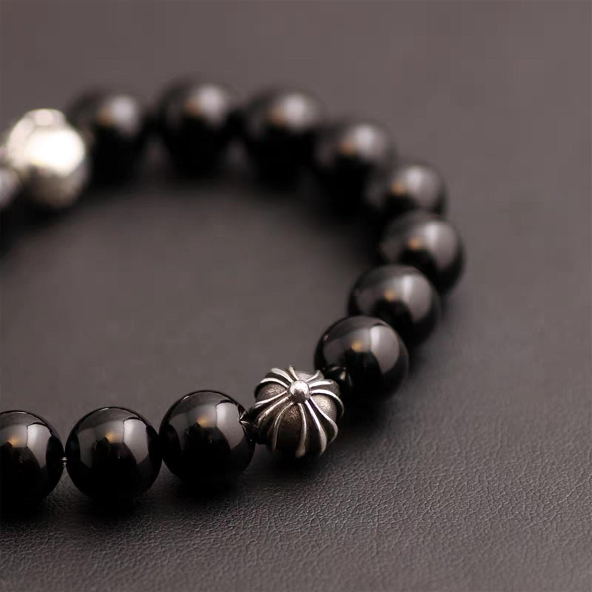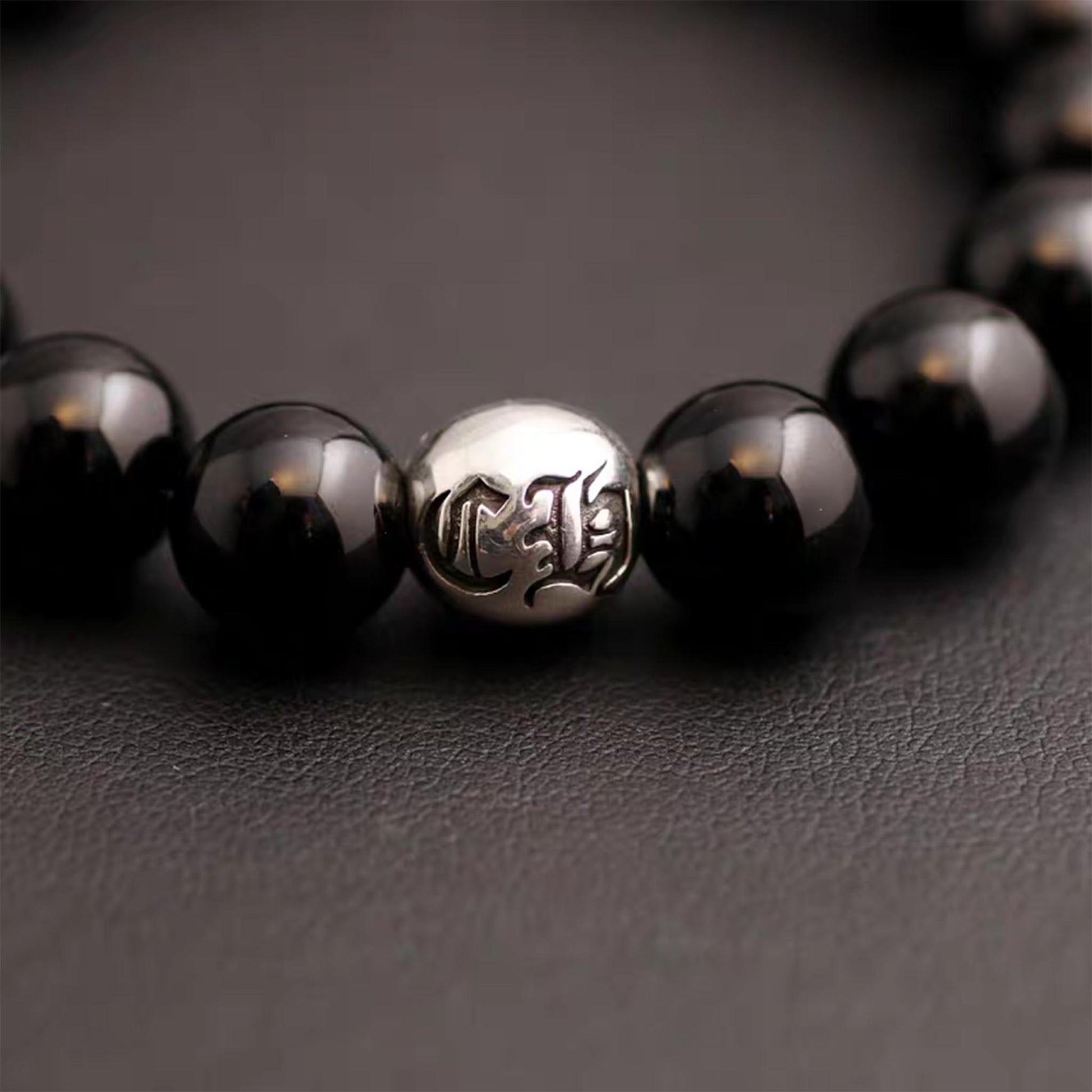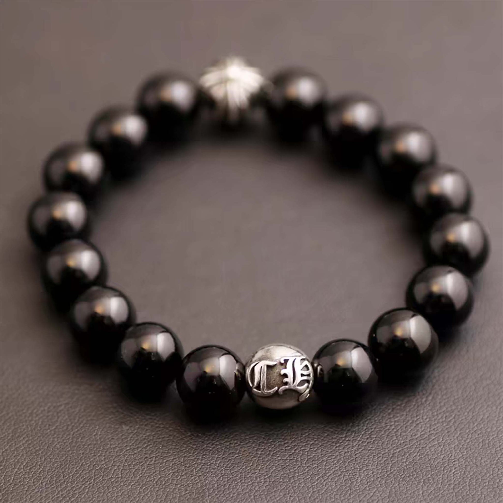 Chrome Hearts Cross & Letters Beads Bracelet, Obsidian & Solid Sterling Silver Ball Bracelets