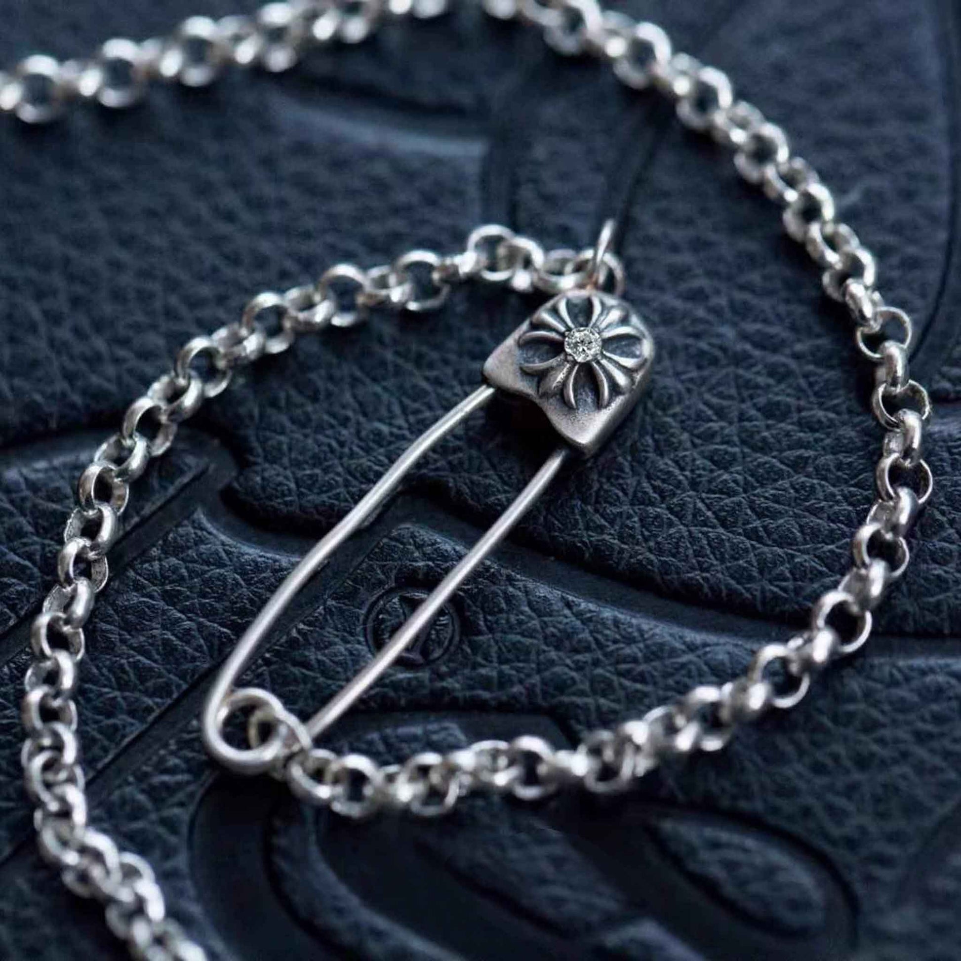 This classic Chrome Hearts safety pin necklace has gorgeous shape and exquisite details, the texture is clear and quite different from the low-end products, please feel free to compare them.