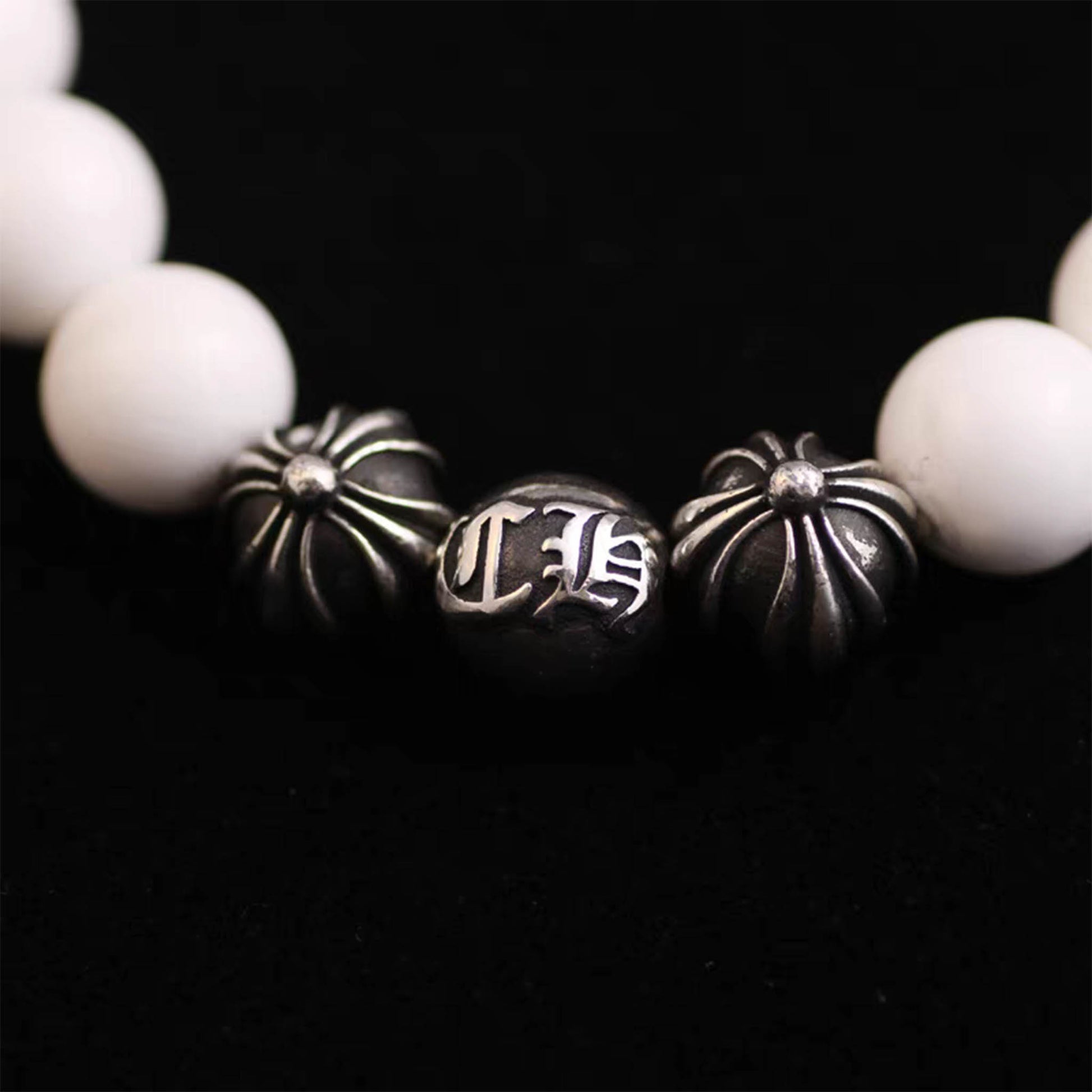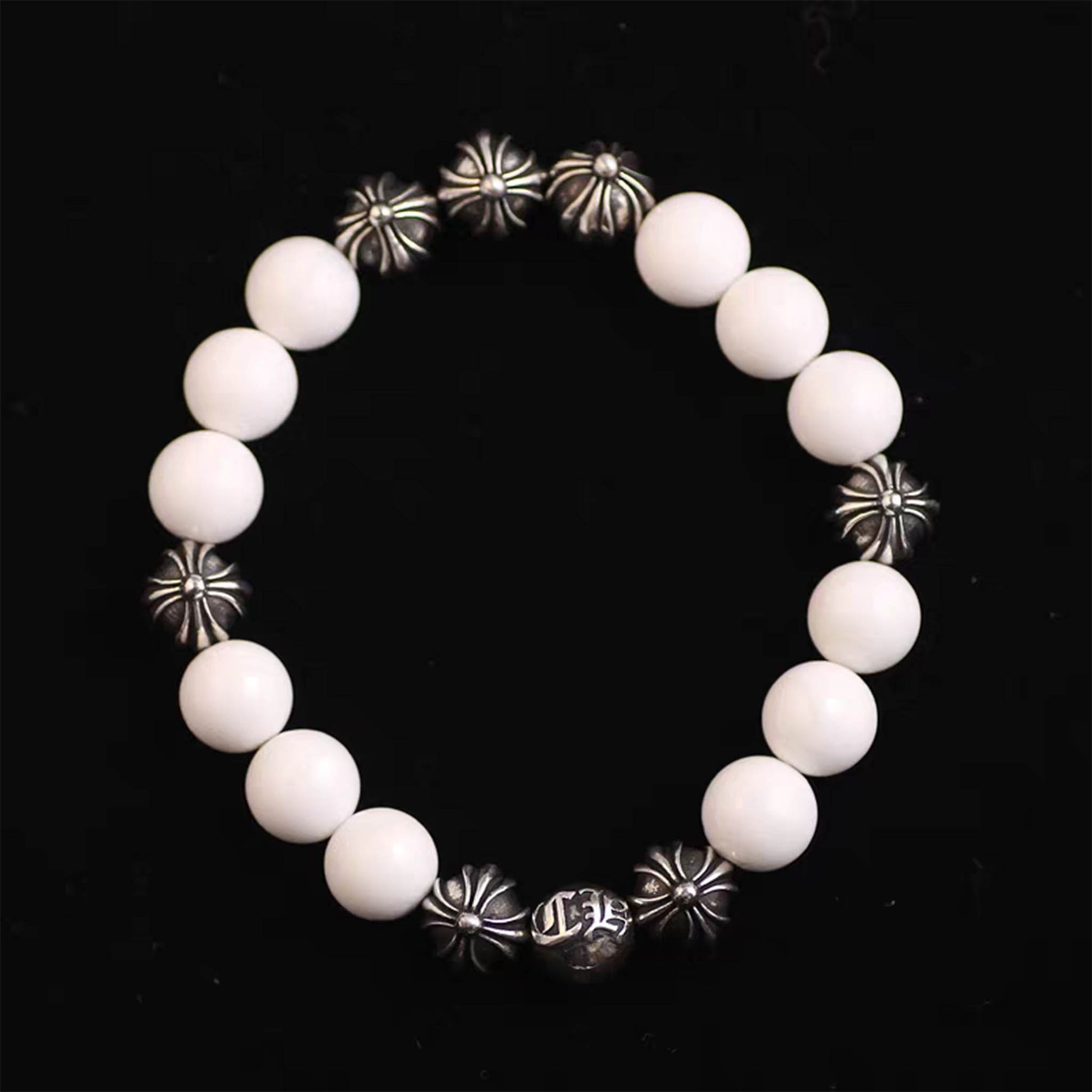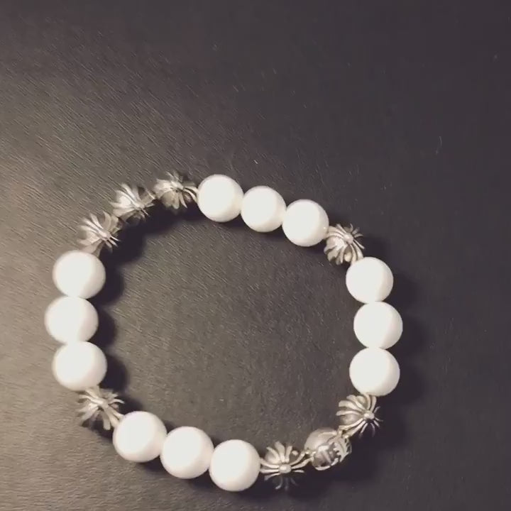 Chrome Hearts White Shell & Solid Silver Beads Bracelet, Gothic Cross & Letters Ball Chain Bracelets
