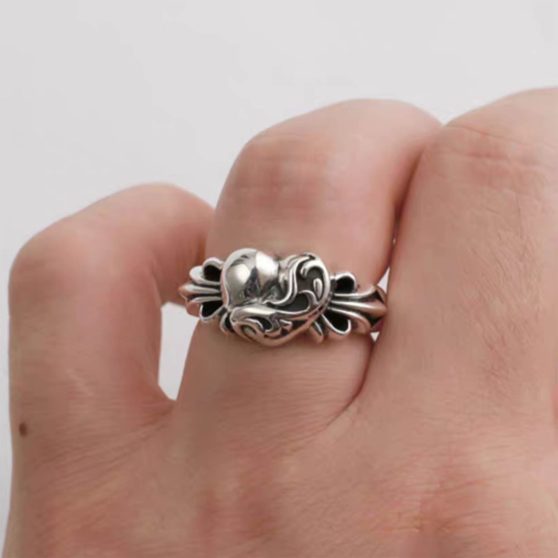 Sterling Silver Gothic Heart Shape Ring, Chrome Hearts Punk Statement Rings